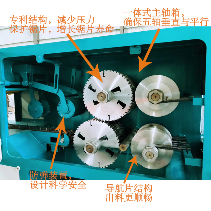 送 料:采用四排尖齒鏈條輸送,機上配有變頻智能調速器,可以對大小木料的進料速度實行自由調速。原木可以實現自動分中,機上還配有限位開關,防止超去規格木料進入,防止卡木避免對機器造成損壞。