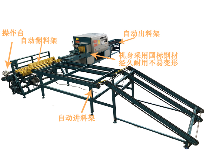 ZQ350型全自動原木多片鋸是針對原木鋸切而設計的專用機床,其主要特點與性能:帶自動進料架、自動出料架、自動翻料架,可自動進料、自動對中、自動出料、自動翻料,極大提高效率降低人力成本。采用五軸結構設計-前鋸后導航確保木板的精確度,無論木板長短均可保證鋸切木材尺寸公差在0.2mm-0.5mm之內,尺寸標準偏差小,節約木料,上下鋸軸,鋸片采用進口帶刮刀鋸片,鋸切表面光滑,無需再刨,保證不燒鋸片。采用自動分中裝置,提高木材的利用率;上壓輥主動增加壓力,送料平穩;軸心噴水冷卻鋸片,去脂降溫,增強鋸片的使用壽命。一次多片,大大提高工效;